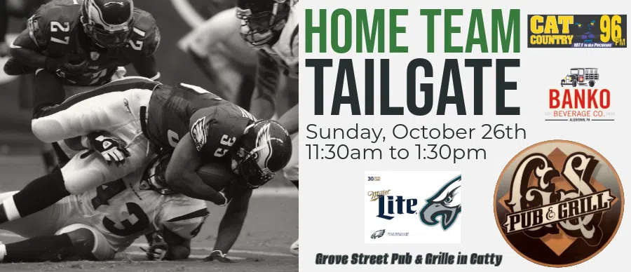 Join Cat Country 96 for a Home Team Tailgate Party at Grove Street Pub & Grille in Catasauqua on Sunday, October 26th from 11:30 am to 1:30 pm! Watch the Philadelphia Eagles vs. NY Giants beginning at 1pm. Win great prizes from Cat Country and Miller Lite, The Official Beer Partner of the Philadelphia Eagles. Sponored by Banko Beverage.